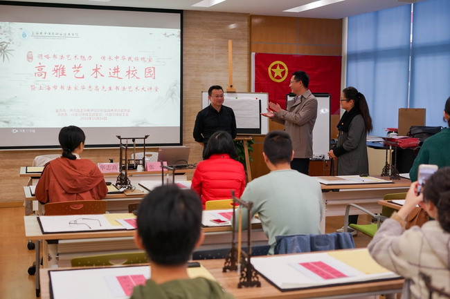 为贯彻中共中央、国务院《关于全面深化新时代教师队伍建设改革的意见》文件精神,落实全国教育大会精神,弘扬社会主义核心价值观和中华优秀传统文化,加强广大教工教学基本功训练和师德师风建设,提升教师的文字功底和综合素质。11月16日下午,由学校团委主办,综合管理教工团支部、综合管理分工会联合承办的“夯实教师基本功,传承中华传统文化” 青年教工主题团日活动在A207顺利举办。活动当天,学校团委特邀请到书法家、上海市书法家协会会员、上海青年书法家协会会员华志高先生给学校教职工带来了“夯实教师基本功,传承中华传统文化”书法艺术大讲堂。学校分管副校长张涛、团委、各教工团支部青年教师代表及学校书法社学生代表共同参加了此次活动。
