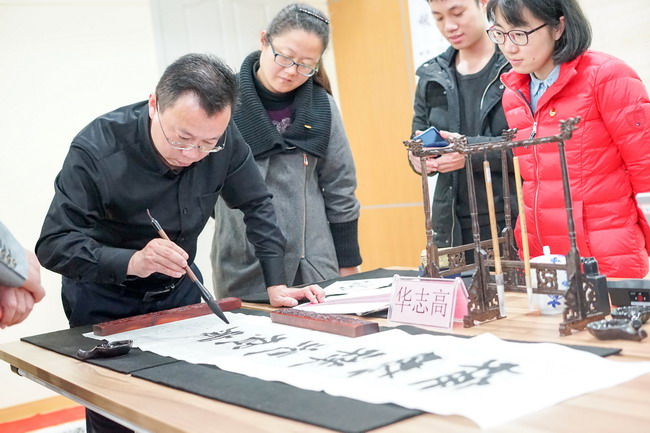 华志高老师用生动风趣的说辞,深入浅出地介绍了中国书法的演变历史,详细地介绍了丰富多彩的书法常识。从基本的点、横、竖开始,华老师一边演示,一边耐心讲解,各位老师或专心致志听讲,或一笔一画临摹,大家都陶醉在传统文化的氛围之中。大家在感受书法艺术魅力的同时,进一步陶冶和提升了精神境界,增强了不忘初心、继续前进的动力。最后,共同观摩了华志高老师创作过程,让大家受益匪浅。