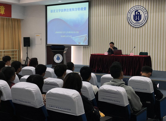 2018年11月19日,《语言文字法律法规与规范知识》培训会在奉贤校区C108召开。上海市语言文字工作委员会办公室干部姜冠成老师来校进行了语言文字法律法规与规范知识的宣讲,培训会由教务处副处长戴玉珍主持,2018级全体学生语言文字联络员和部分2017级语言文字联络员出席了会议。