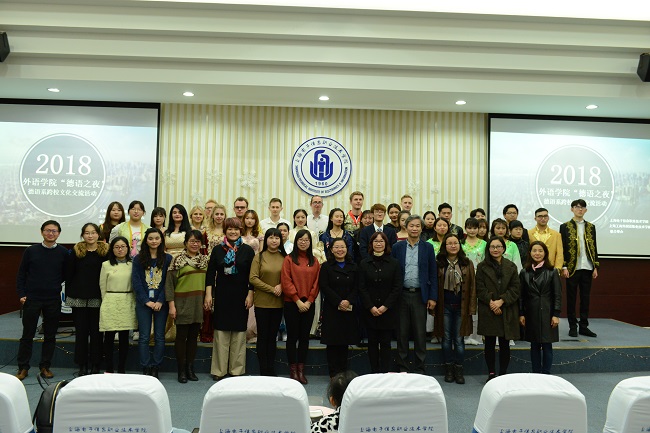 下午六点,中德C楼108多功能报告厅热闹非凡。外语学院副院长肖潇老师、党总支副书记吴亚人老师、副院长邓玉华老师、国际交流部副处长邱娟老师与教务处副处长戴玉珍老师以及外语学院德语系全体教师、上海工商外国语职业技术学院全体德语老师、两校德语系在校生、全体德国交流生和部分中德与工程技术学院师生参加了本次文化交流晚会。