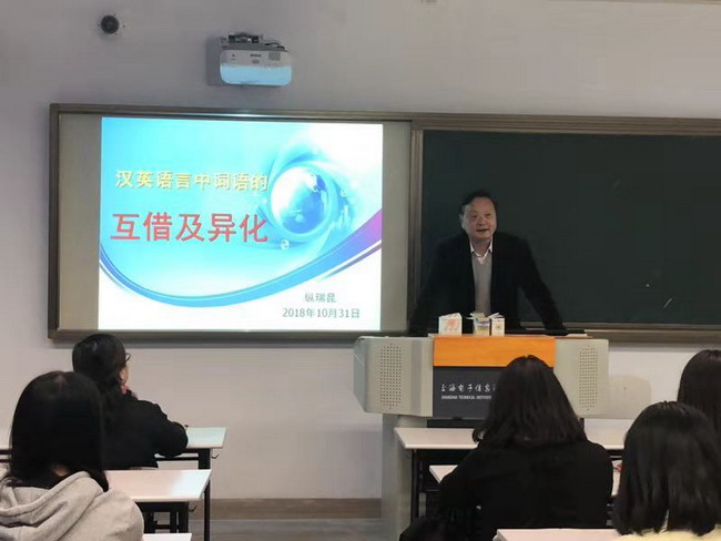来自上海行健职业学院的纵瑞昆教授为英语系学生带来了题为“汉英语言中词语的互借及异化”的主题讲座。首先,纵瑞昆教授带领同学们熟悉上海话。接着,纵教授从语音、字母借读与字母直读、首字母拼读等方面讲解汉语中的英文与英文中的汉语,并从词语层面对中外语言文化进行了详细的对比。