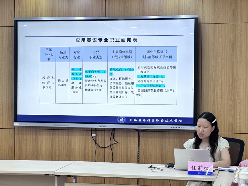 应用英语专业主任任莉枫汇报了《2025级应用英语专业人才培养方案》的修订情况。新版方案以服务国家“一带一路”倡议,培养具备英语沟通能力的跨境电商应用型人才为目标,强调课程体系优化与新兴技术融合,新增“跨境电商英语实务”“AI与语言应用”等课程模块,致力于提升学生数字素养、翻译技术及外语实践能力。