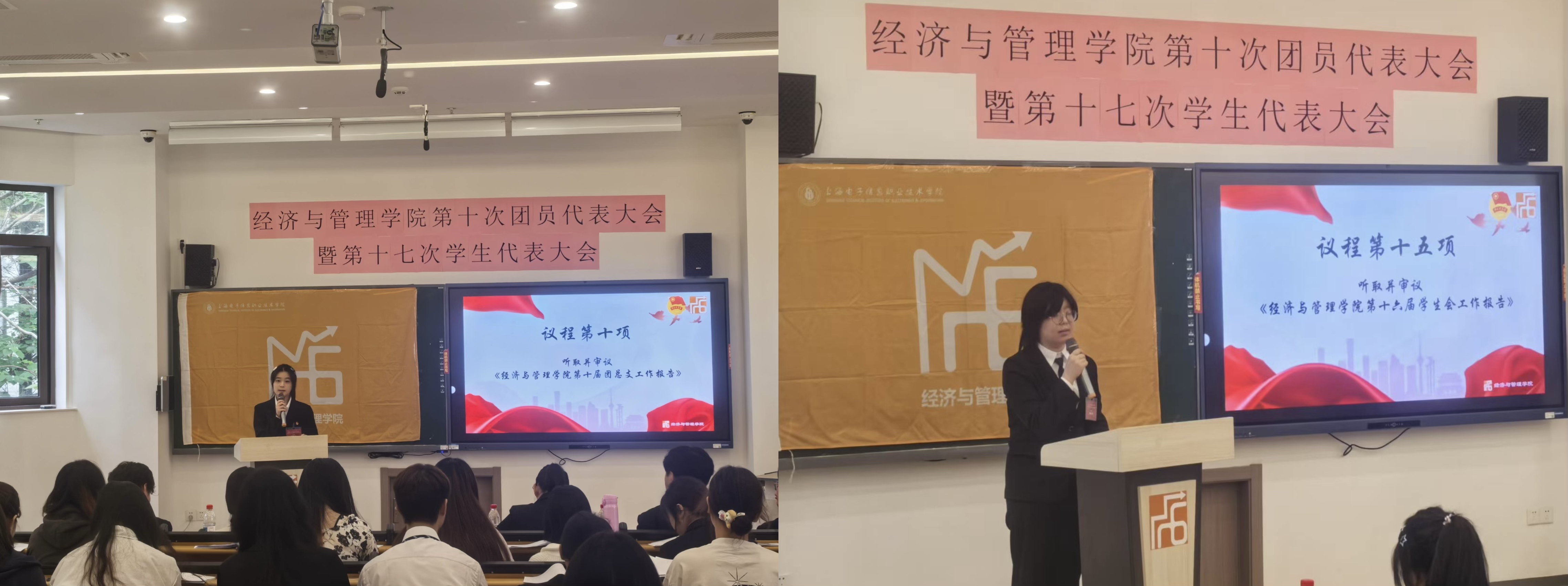第十届团总支副书记朱芸倩同学作《经济与管理学院第十届团总支工作报告》,从多个工作维度回顾了过去一年的工作情况;第十六届学生会主席孙丹琳同学作《经济与管理学院第十六届学生会工作报告》,对第十六届学生会的工作进行了全面梳理,并对未来工作提出展望。