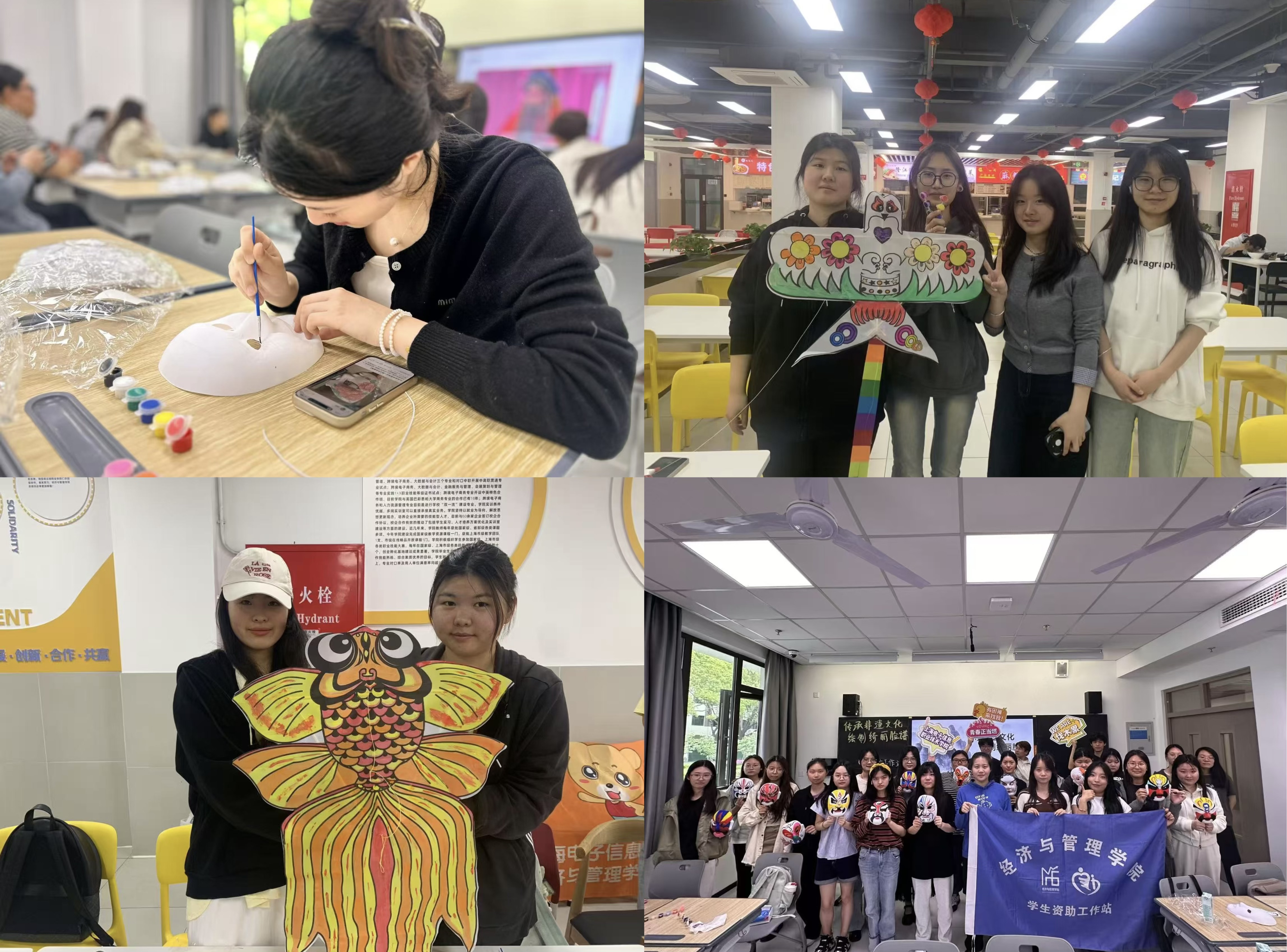为进一步弘扬中华优秀传统文化,增强大学生的文化自信与非遗保护意识,经济与管理学院举办了系列活动。学院学生资助工作站于4月23日开展了“传承非遗文化·绘制绮丽脸谱”活动。同学们跟随国家级京剧表演艺术家王佩瑜的《京剧入门:生旦净丑与变脸艺术》视频,透过经典角色,解码脸谱艺术“寓褒贬、别善恶”的文化密码。易班工作站于4月27日在金山校区食堂开展了“绘梦纸鸢·放飞梦想”非遗体验活动。活动现场同学们围坐一堂在空白纸鸢展开创作,在纸笔线的交织下解锁传统手工艺的魅力。