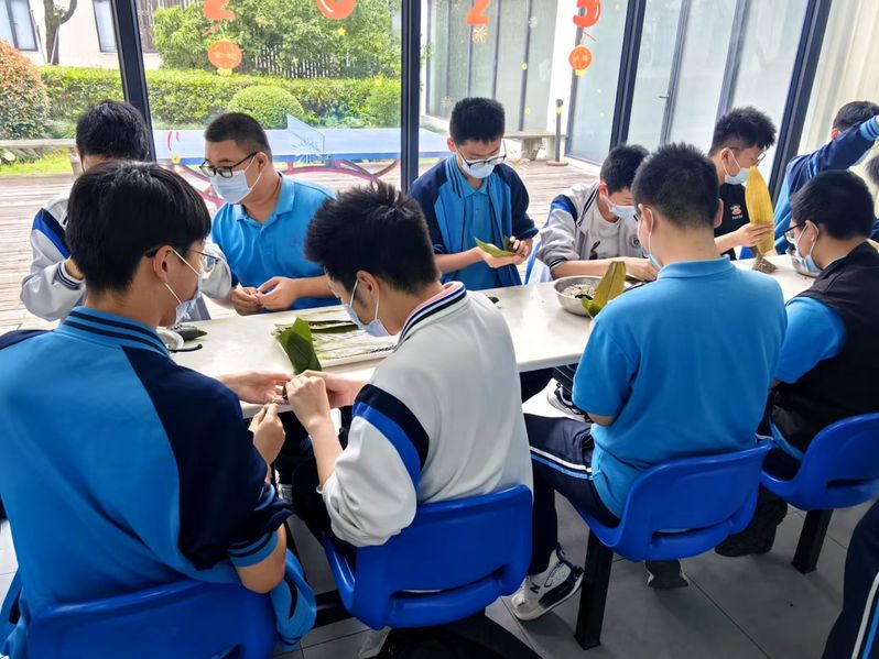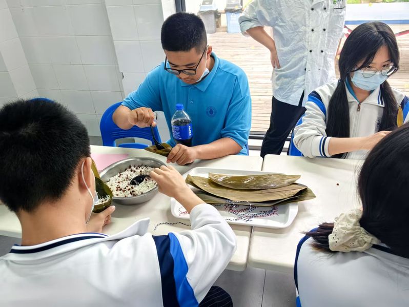 活动现场,箬叶的沙沙声与欢声笑语交织。有人偷偷在粽子里多藏一颗蜜枣,有人为缠紧棉绳而憋红了脸。食堂师傅穿梭其间,时而纠正手法,时而夸赞“这个包得俊”。当热气腾腾的粽子出锅时,同学们捧着亲手制作的成果,眼底满是成就感——除了带走自己包的粽子,每人还获赠两枚食堂准备的不同口味的熟粽,将这份温情带回宿舍,让粽香萦绕在朝夕相处的时光里。