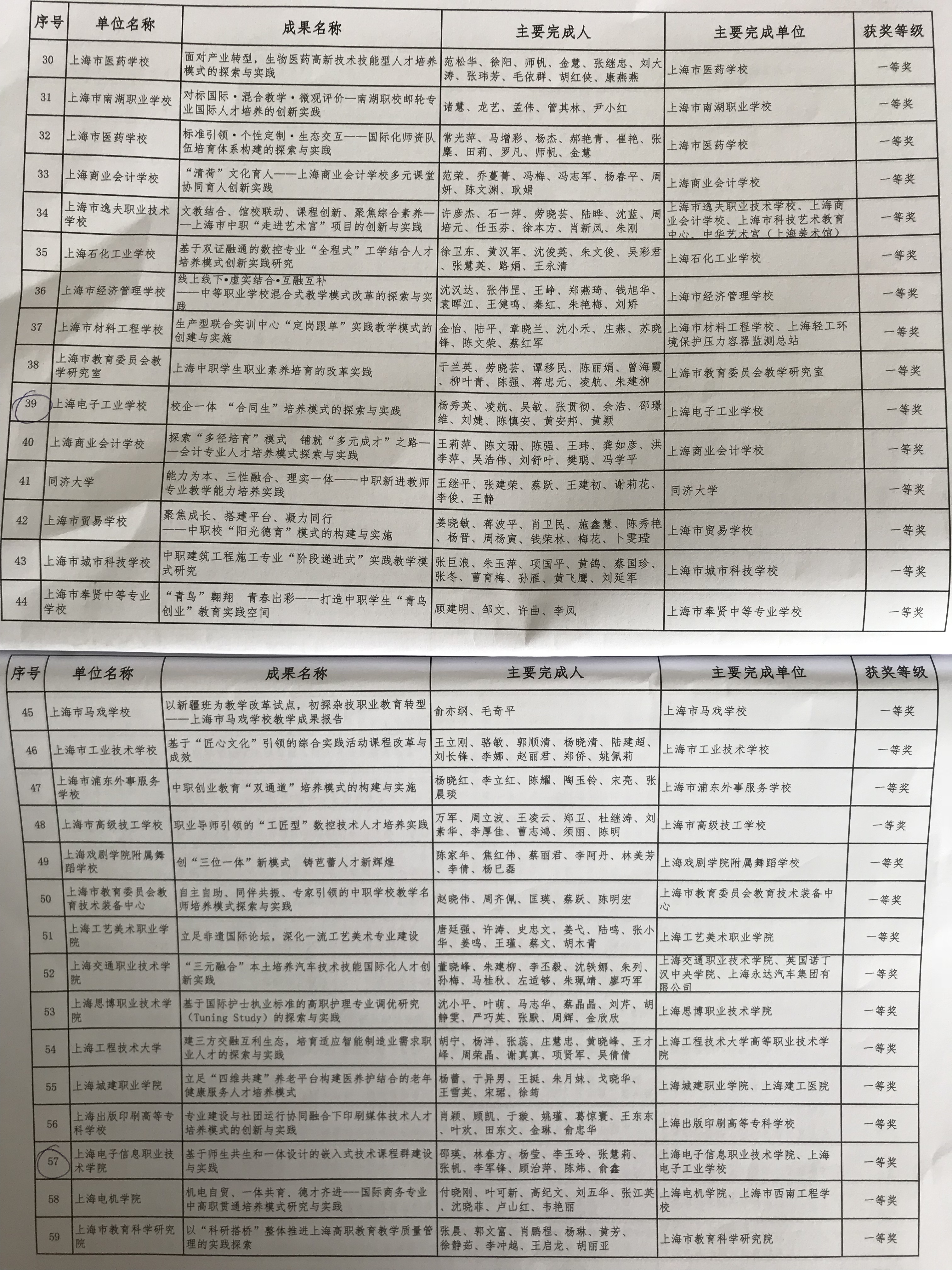 学校系统获得2017年上海市教学成果奖(职业教育)一等奖4项、二等奖4项