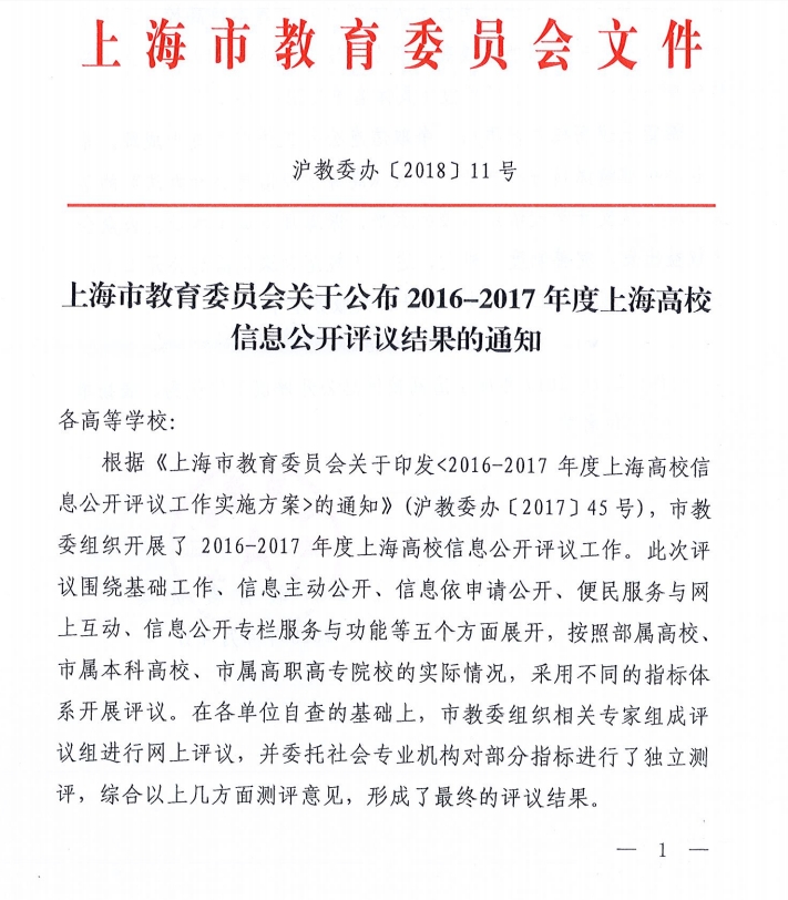 学校荣获2016-2017年度上海高校信息公开评议工作优秀单位